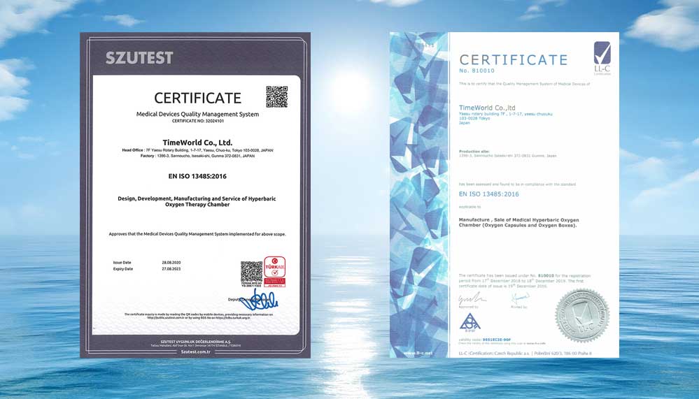 本公司作為日本醫(yī)療器械制造商引進(jìn)了先進(jìn)的品質(zhì)管理系統(tǒng)。公司生產(chǎn)的全系列產(chǎn)品獲得了ISO13485醫(yī)療器械質(zhì)量管理體系國(guó)際認(rèn)證,同時(shí)也獲得了歐盟CE MDD醫(yī)療器械93/42/EEC國(guó)際認(rèn)證,O2BOX高壓氧艙還得到了NASA美國(guó)宇航局"指導(dǎo)企業(yè)科技與品質(zhì)"認(rèn)可。